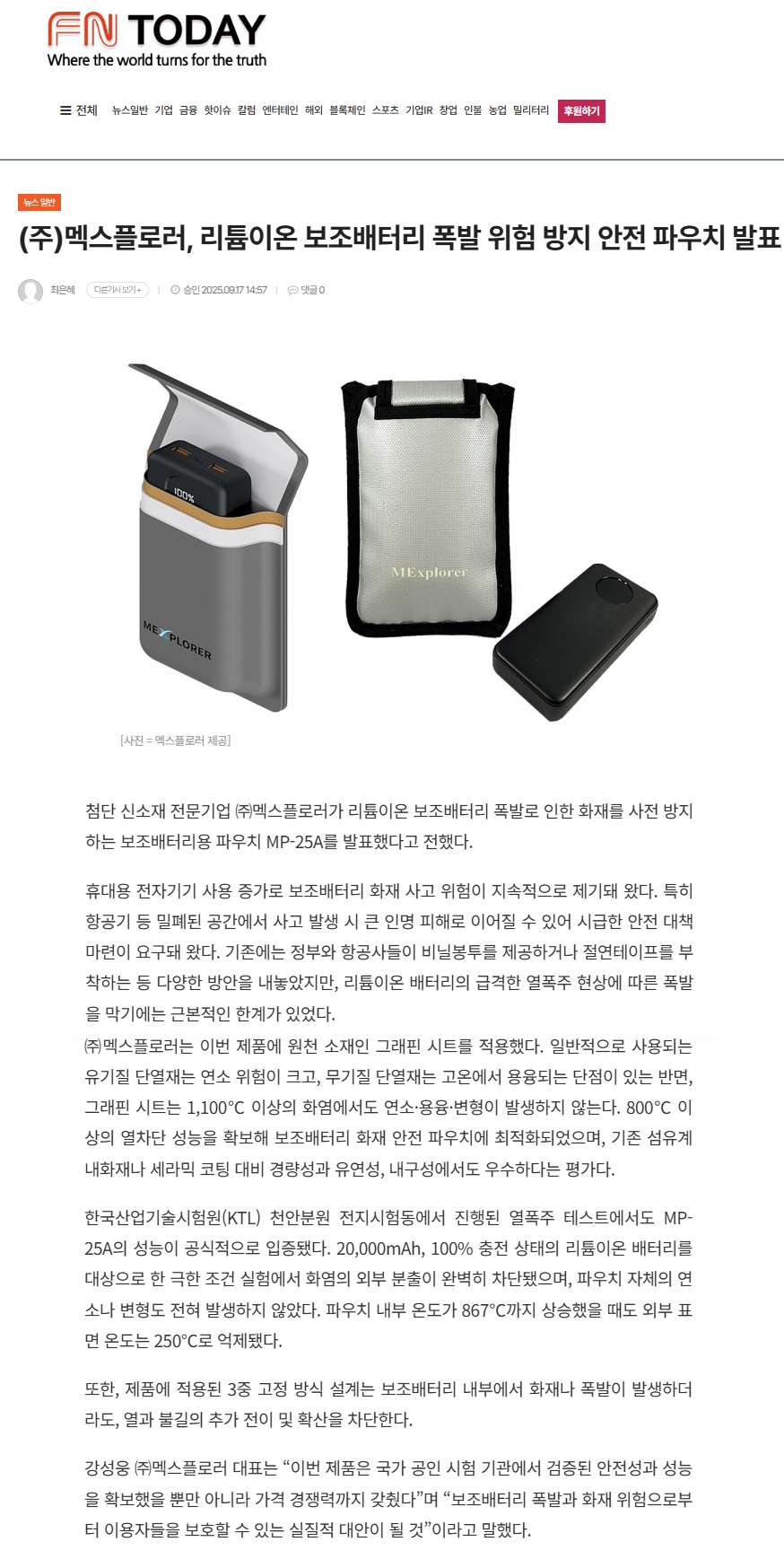 Notice 멕스플로러의 새로운 기술과 제품 소식을 전해드립니다. 2025.09.17 [파이낸스투데이] (주)멕스플로러, 리튬이온 보조배터리 폭발 위험 방지 안전 파우치 발표 *등록일 : 2025-09-18 *조회수 : 103회 https://www.fntoday.co.kr/news/articleView.html?idxno=363840 목록